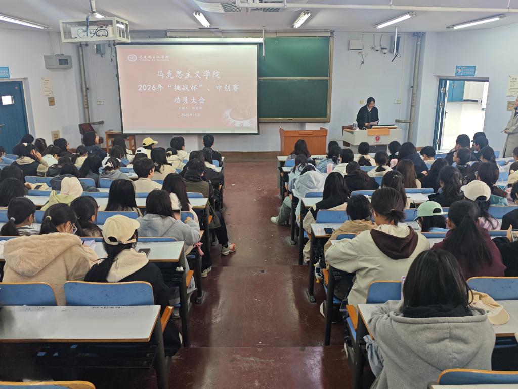 为充分激发学生创新思维,鼓励学生积极参与2026年“挑战杯”、“中创赛”,推动赛事顺利进行。11月1日,我院于和鸣阶梯1301教室组织学生召开2026年“挑战杯”、“中创赛”动员大会。2023级学生赵蕊及科创部志愿者主讲。