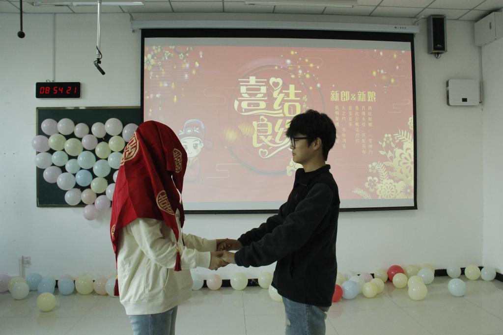 本次生命体验活动设有五大体验站,分别是“结婚”、“孕育”、“残障”、“死亡”及感悟分享站。在工作人员的指导下,我院学生积极参与其中。在结婚体验环节,体验者们分为两组,分别体验了中式传统婚礼和西式婚礼两种形式,在主持人的主持下进行了宣读誓言、掀盖头、喝交杯酒等环节,体验了婚姻的幸福美好;在孕育体验环节,体验者们将气球塞入衣服,在保护气球的同时,完成俯身拾物、弯腰系鞋带等日常动作,真切感知孕期的诸多不便与母亲的艰辛;在残障体验环节,同学们被蒙上眼罩,二人一组协作完成闯过气球障碍、据字画图等多个环节模拟感受残障人士的生活不易,也让理解、尊重、互助在协作中悄然扎根;在死亡体验环节,同学们在工作人员的指引下闭上双眼,慢慢回想自己过去的经历和人生,并将自己的思考感悟写在卡片上与其他同学进行交流分享。唤起对生命的珍视;四个环节体验结束后,工作人员引导学生们进入分享区,同学们自觉分成小组,积极分享在这次体验活动中的思想感悟。