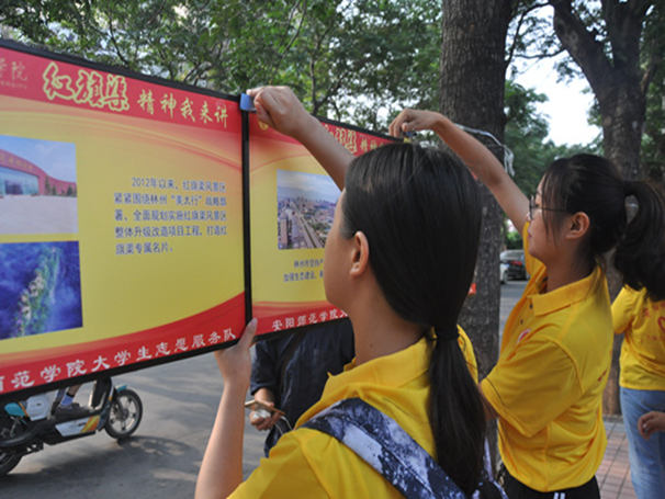 早饭时间,队员们为就餐群体盛菜、端饭,将一碗碗热气腾腾的粥送到他们手中。在盛饭时一位老人这样说道:“小姑娘,刚才讲的可真好,红旗渠精神就该这样传下去。一会儿你们还讲吗?大爷呀想再听一遍!”“谢谢爷爷,一会儿我们还会再讲的!”听到老人的夸奖,队员赶紧应道。是啊,红旗渠精神博大精深,学千遍万遍仍意犹未尽。