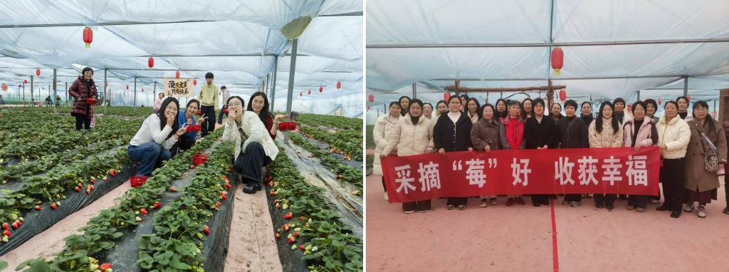 活动现场,女教工们漫步温室大棚,在果香四溢中体验采摘乐趣,感受春日生机。大家一边挑选饱满的草莓,一边交流工作生活趣事,欢声笑语回荡在棚内。随后,全体人员手持活动横幅合影留念,定格温馨瞬间。
